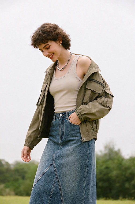 The utility jacket adds pockets and light structure, while the neutral tank keeps the outfit easy and versatile. The skirt provides coverage and a polished spring silhouette. Perfect for unpredictable spring weather, casual outings, or coffee dates—you’ll wear it again without thinking.