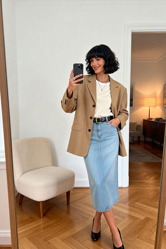 The camel blazer adds structured volume while keeping the look relaxed and modern. Paired with a simple off-white tee, it balances polished and casual elements effortlessly. The light blue denim skirt introduces a soft.