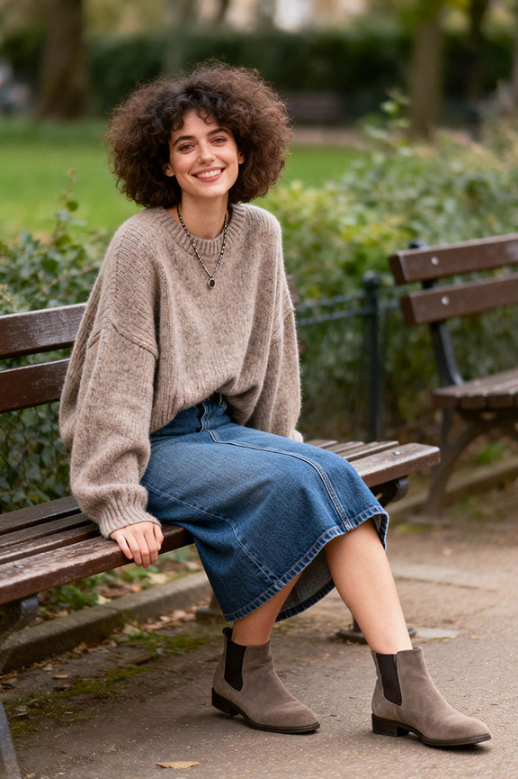 The soft sweater relaxes the look while the skirt keeps it grounded. Sneakers make the outfit practical for long days out. Easy, comfortable, and repeatable for weekends or travel.