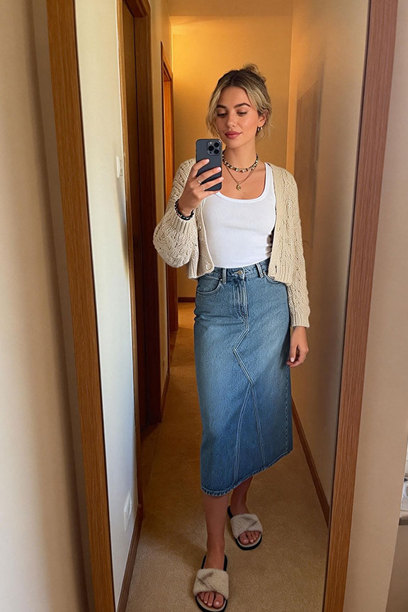 White Tank + Knit Cardigan + Denim Skirt + Slides