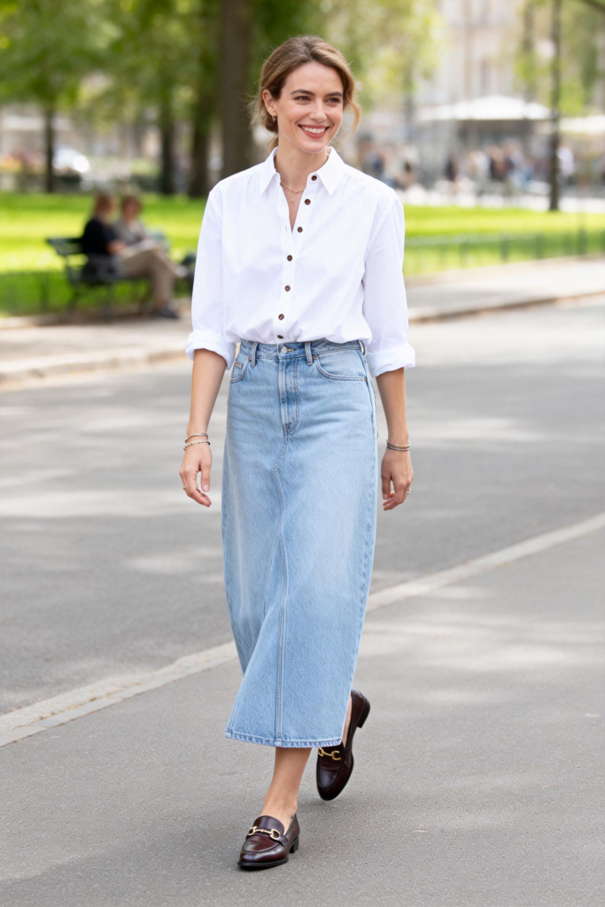 A crisp white shirt balances the casual feel of a denim skirt and keeps the look clean. Loafers add structure while staying comfortable for walking. This works for office days, errands, or casual lunches—and you’ll wear it all spring.