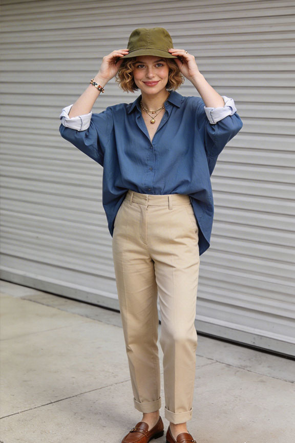 Mid-rise beige trousers with an oversized blue shirt. Roll the sleeves once and add brown loafers. Polished and breathable for casual Fridays or desk-to-lunch transitions.