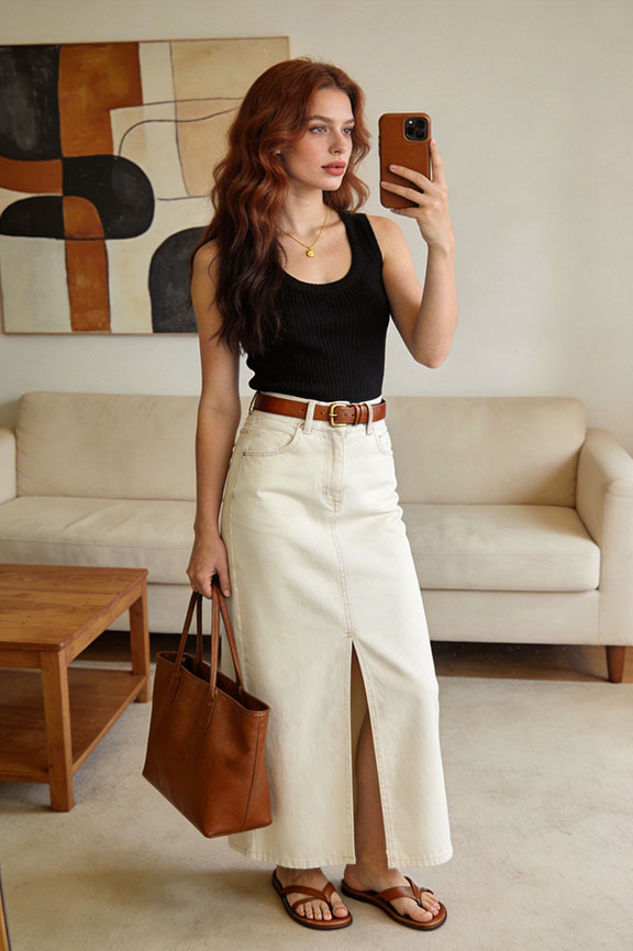 Black knit tank and cream denim maxi skirt strike an effortless contrast. A slim leather belt cinches the waist, brown sandals add warmth — quietly polished and summer work-ready.