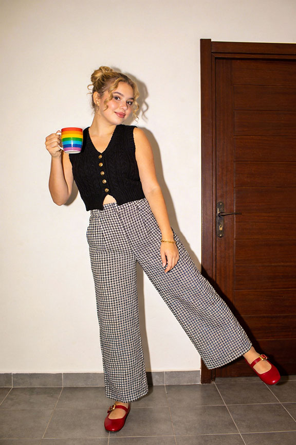 Black knit vest and classic check wide-leg trousers create sharp monochrome structure. Red Mary Janes inject a bold pop of contrast — vintage-inspired, polished, and effortlessly work-ready for summer.