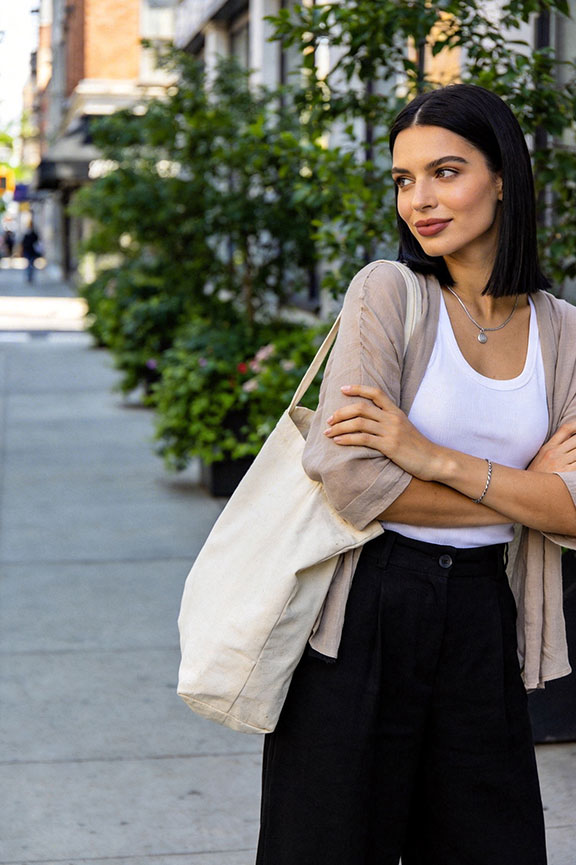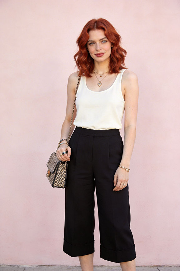 Black cropped trousers with a thick ivory tank. A structured handbag adds subtle refinement. Polished and practical.