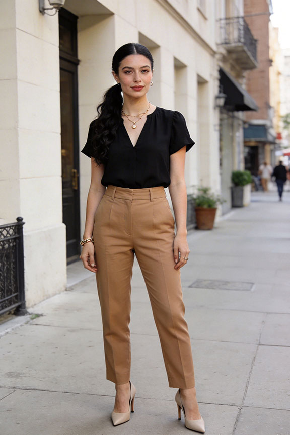 High-waisted camel trousers with a soft black blouse. Neutral heels refine proportions. Polished and practical.