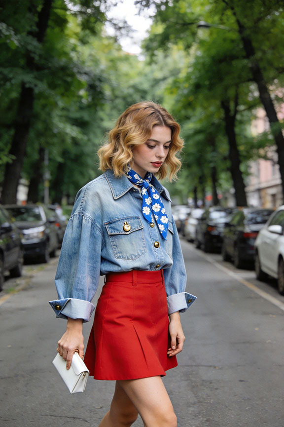 A washed denim shirt pairs with a bold red A-line mini skirt in striking contrast. A blue floral neck scarf adds vintage Italian charm — casual, vibrant, and effortlessly summer-ready.