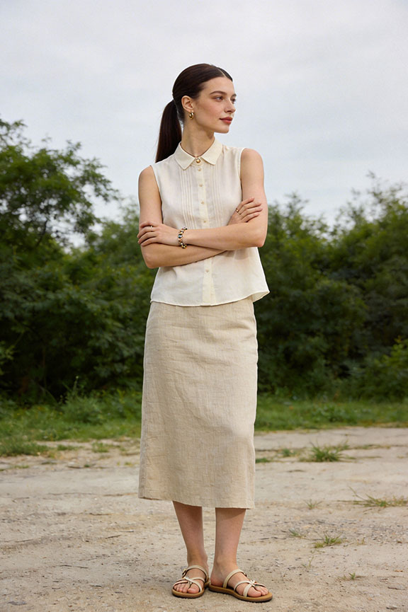 Neutral linen skirt with a fitted sleeveless top keeps airflow steady. Flat sandals maintain easy wear. Breathable and polished.