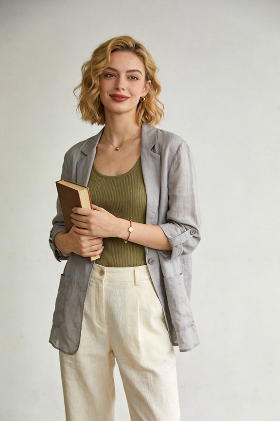 Cream linen trousers with a sage ribbed tank and lightweight blazer. Linen keeps it breathable; the blazer adds just enough structure. Polished without overheating.