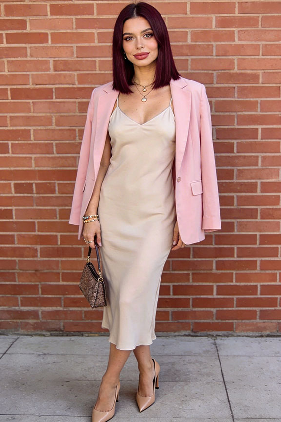 Neutral slip dress layered with a lightweight blazer. Low heels refine the silhouette. Minimal yet structured.