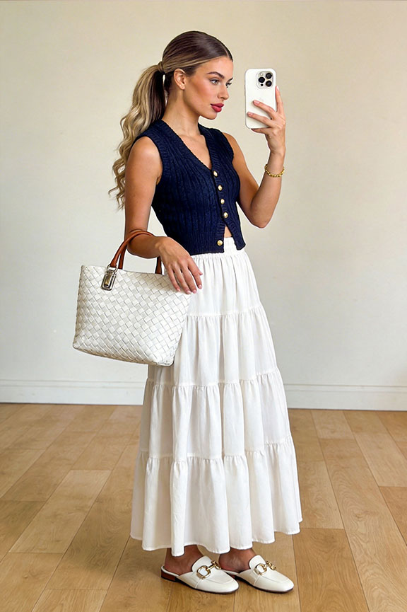Navy sleeveless knit vest and white pleated maxi skirt create a crisp, romantic contrast. Metal buttons add polish, while the full skirt brings effortless movement — structured, feminine, and summer work-ready.