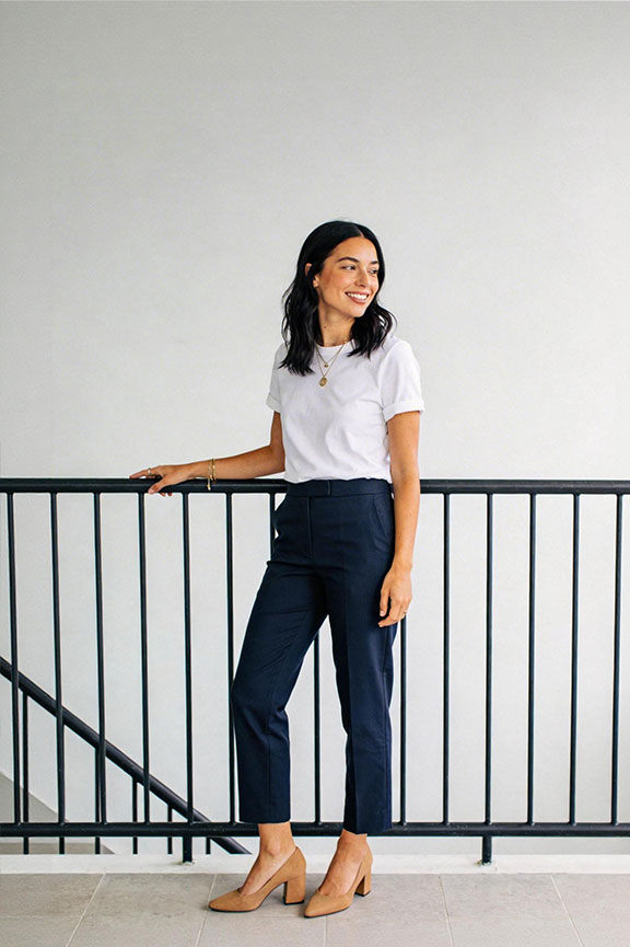 Tailored navy pants with a thick white tee tucked in slightly. Low block heels add subtle polish. Streamlined and professional.