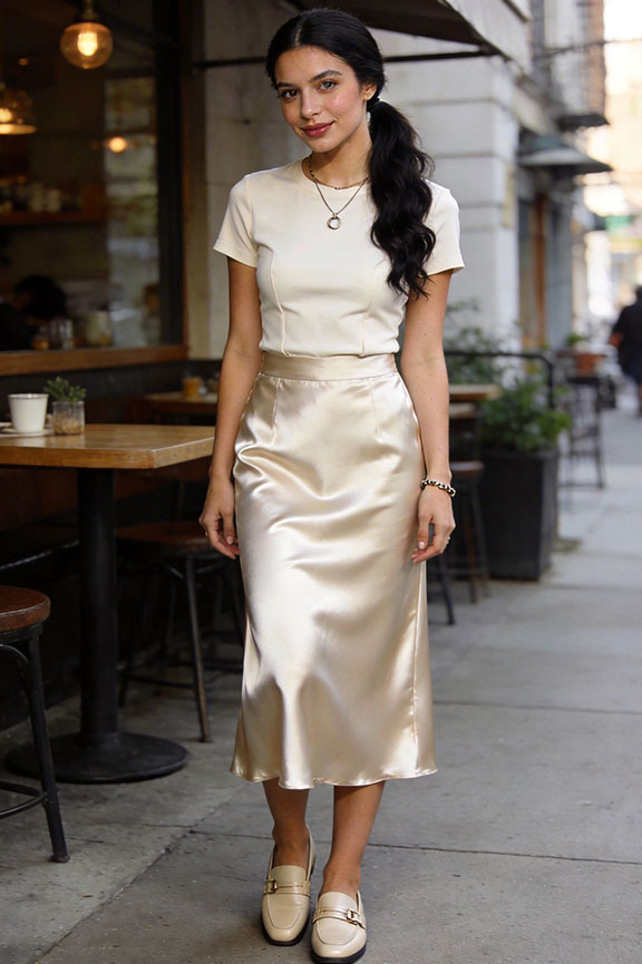 Champagne satin skirt with a fitted structured tee tucked in slightly. Loafers refine the look and keep it wearable. Elevated and comfortable.