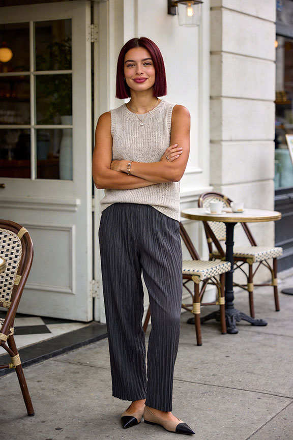 Sleeveless Knit Top + Pleated Trousers + Pointed Flats