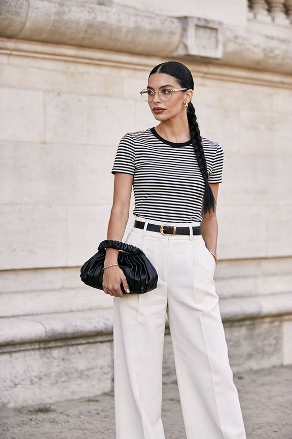 A classic striped tee tucks into crisp white wide-leg trousers for a clean, elongating contrast. A slim black belt defines the waist, gold-frame glasses add cool polish — effortlessly sharp and summer-ready.