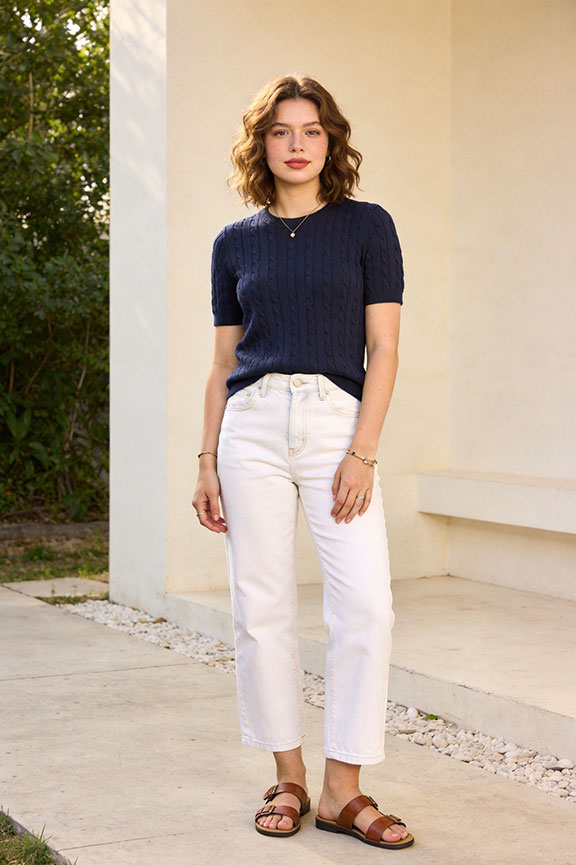 Crisp white jeans with a navy knit top create fresh summer contrast. Leather sandals maintain structure. Relaxed yet polished.