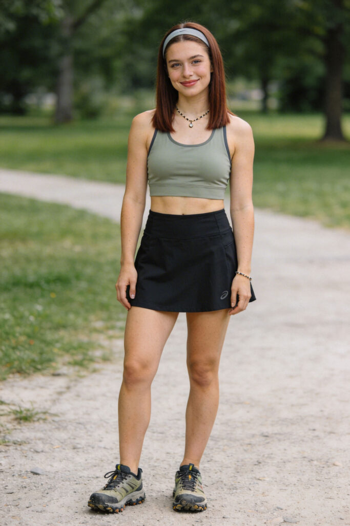An athletic skort offers freedom of movement while maintaining a playful outdoor look. A cropped tank keeps the upper half cool, and trail running shoes add traction and flexibility. Light and energetic.