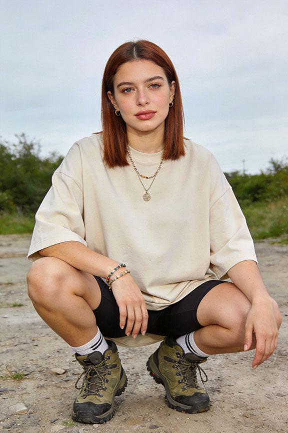 Bike shorts paired with a loose tee create a casual outdoor silhouette. Hiking boots anchor the look with dependable grip and durability.