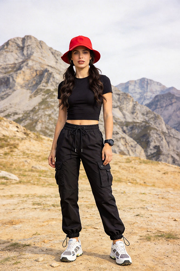 A black crop tee and matching black cargo joggers create a sleek all-black base. White sneakers and a red baseball cap break the monochrome — sharp, functional, and trail-ready.