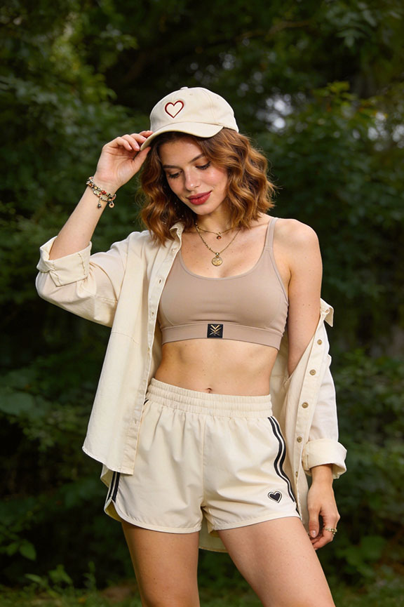 Performance shorts with a supportive sports bra keep movement unrestricted. An open cotton shirt adds breathable coverage while allowing instant ventilation.