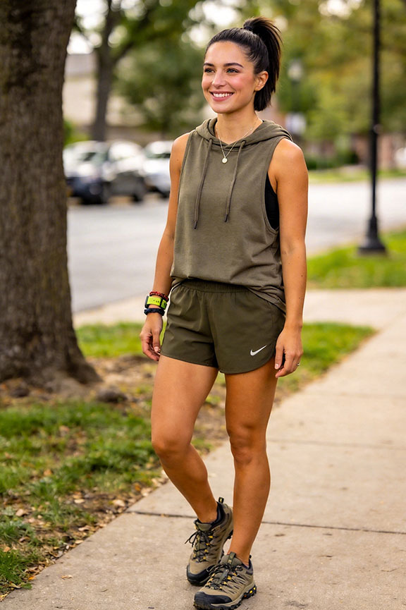 Stretch hiking shorts paired with a sleeveless hoodie create sporty balance without overheating. Trail sneakers keep the base grounded and responsive.