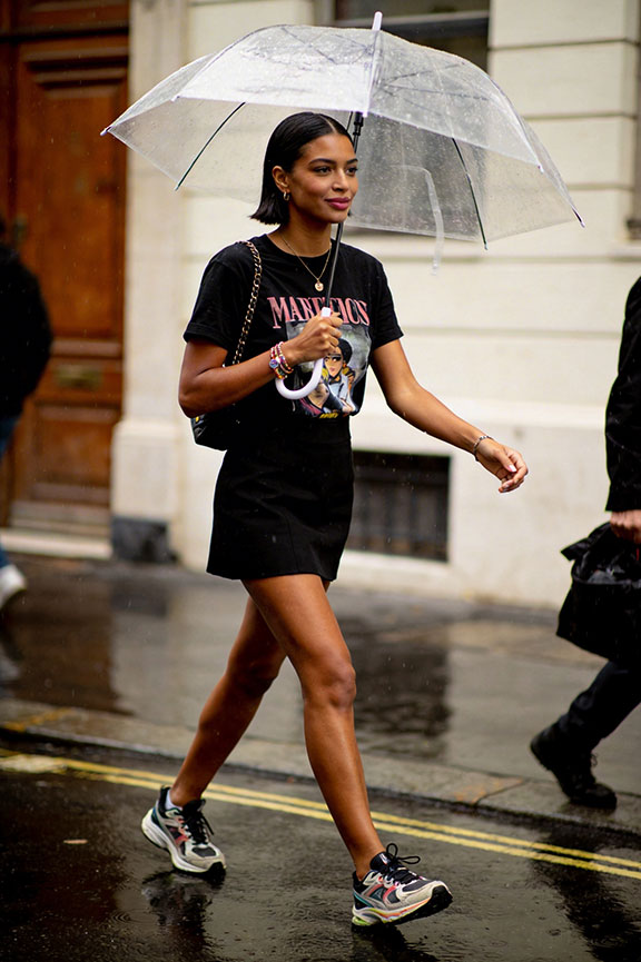 A cotton shirt dress offers airflow, structure, and easy one-piece dressing. Sneakers keep the outfit grounded, practical, and ready for wet streets. Simple and pulled together without extra effort.