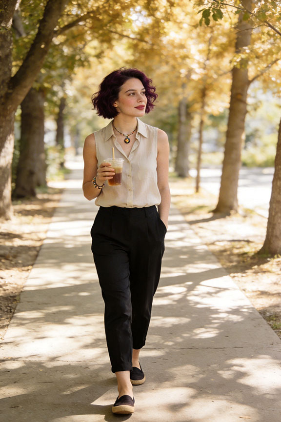 Lightweight trousers maintain polish without heaviness or clingy fabrics when damp. A sleeveless blouse prevents overheating and keeps arms free for airflow. Clean and balanced for smart casual settings.