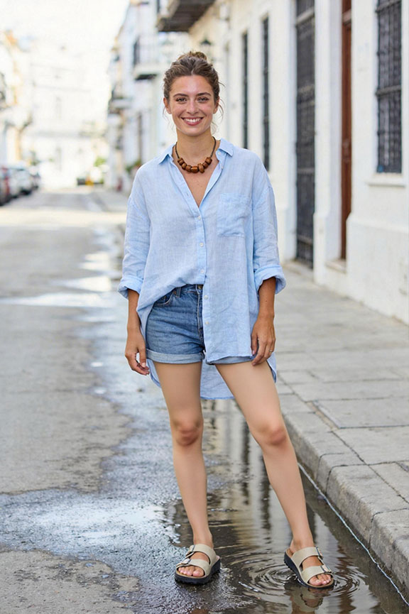 Shorts prevent damp hems on wet pavement and keep legs free. An oversized cotton shirt feels airy, relaxed, and dries quickly if caught in rain. Rubber sandals handle puddles without worry or damage.