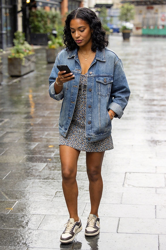 A mini length avoids damp fabric at the hem and keeps movement unrestricted. A lightweight denim jacket adds shape and coverage for cooler rain. Casual with subtle structure that feels intentional.
