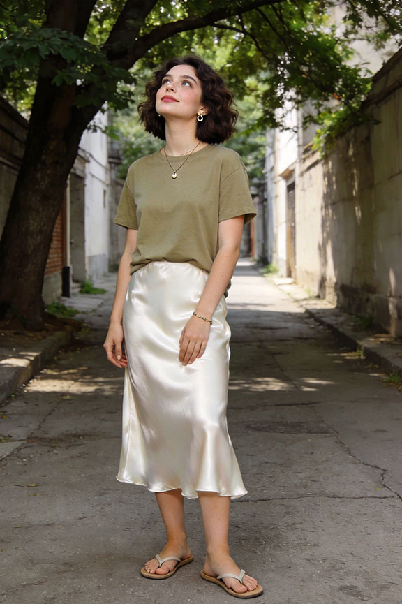 A slip skirt moves easily and dries faster than heavier fabrics or denim. A simple tee keeps the outfit grounded and prevents it from feeling too dressy. Minimal and practical for humid summer days.