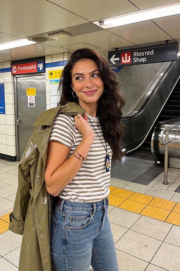 Stripes add visual interest to a simple base without overwhelming the outfit. A lightweight raincoat keeps the look functional and weather-ready throughout. Classic and dependable for unpredictable summer days.