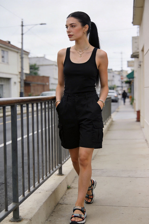 Utility shorts feel practical in wet conditions and offer functional pockets. A minimal tank keeps the silhouette sharp and prevents overheating completely. Sport sandals handle slick sidewalks easily and dry fast.