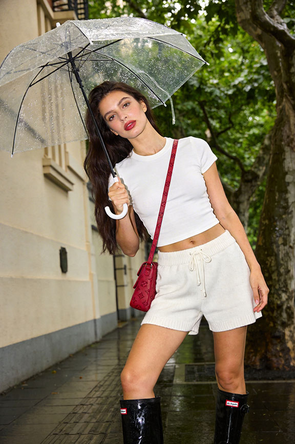 White fitted tee meets high-waist drawstring shorts in clean monochrome. Black patent rain boots create sharp contrast. A red vintage clutch and transparent umbrella complete the effortless rainy-day city look.