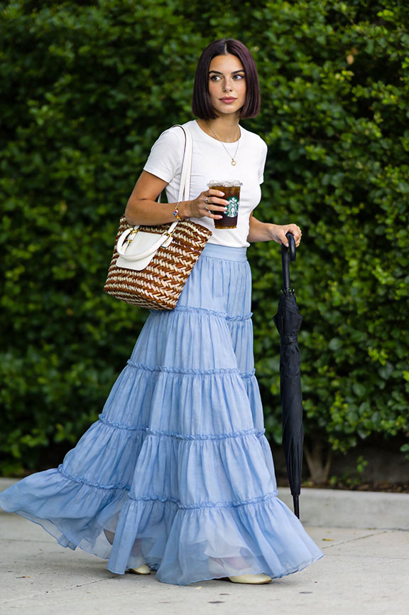 White fitted tee meets a light blue pleated maxi skirt in breezy romance. Tonal footwear keeps the palette clean. A white-and-tan woven tote adds relaxed vintage charm effortlessly.