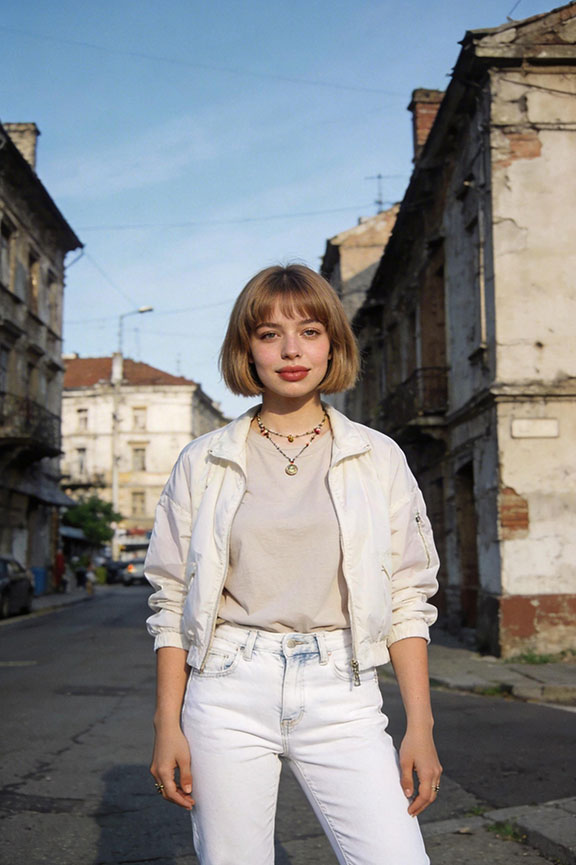 White denim feels fresh even on gray, overcast summer days. A neutral tee keeps things understated and prevents color overload. A thin jacket adds protection without weight or bulk.