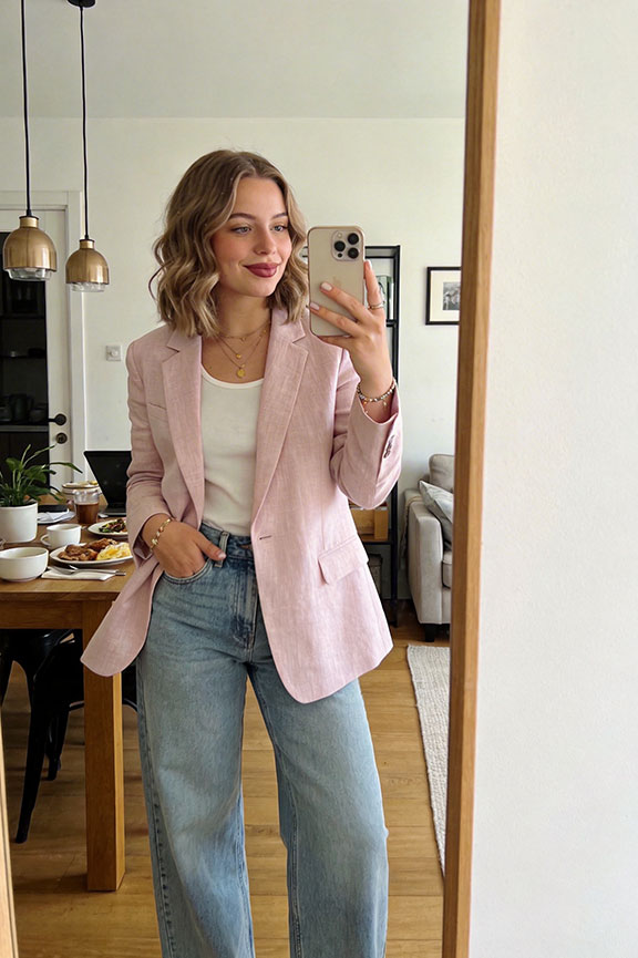 Choose a lightweight blazer in linen or cotton for breathability. Keep the base simple underneath to avoid bulk and maintain clean lines. Tailored but breathable for casual office days or work lunches.