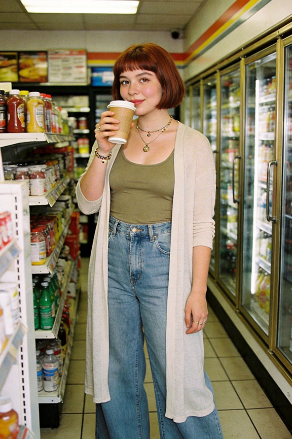 Showing a bit of shoulder offsets the volume of the jeans naturally. Keep accessories minimal for balance and let the silhouette shine. Feminine and relaxed.