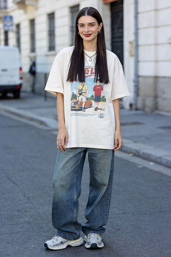 An oversized tee creates a laid-back feel for casual summer days. Half-tuck it to maintain structure and avoid losing your shape completely. Casual but balanced.
