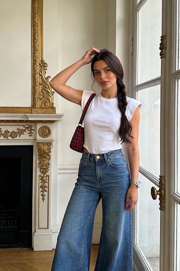 A white sleeveless tank with padded shoulders adds structure and clean lines. High-waisted wide-leg jeans in classic blue create retro flow and elongate the silhouette. A red and black plaid woven bag adds contrast and becomes the visual focal point.