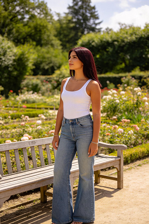A tailored or square-neck tank sharpens the overall silhouette instantly. It elevates the jeans without adding weight or bulk in hot weather. Sleek and refined.