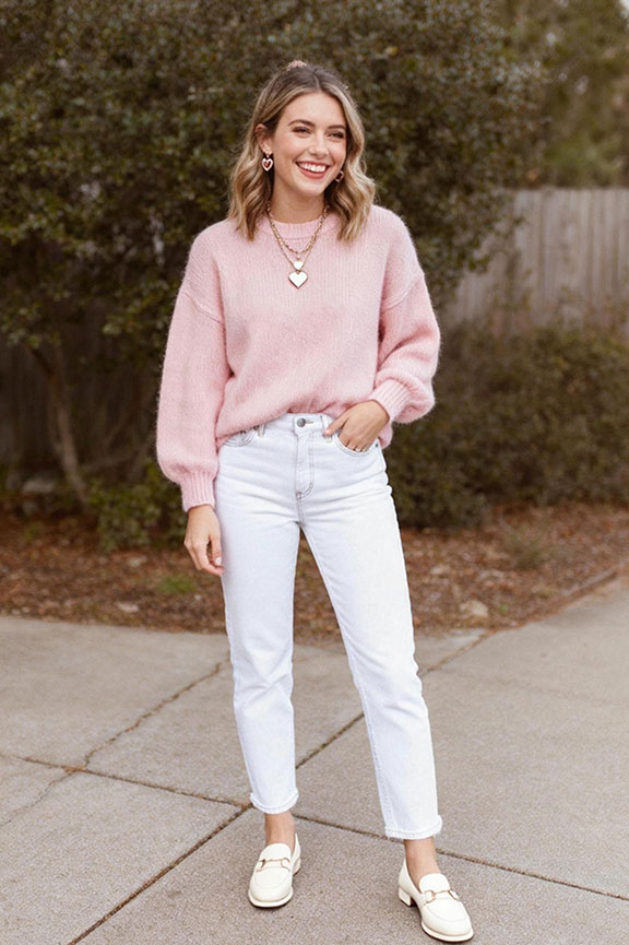 Blush pink brings Valentine’s vibes without screaming “look at me,” while white jeans keep the outfit fresh and modern. Loafers mean you can actually walk comfortably between dinner and drinks. Works for casual dates or low-key evenings—you’ll wear this combo again for weekend brunches.