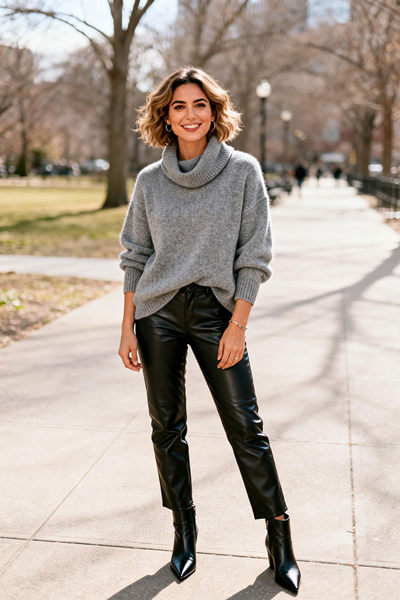 Soft meets edgy with a draped cowl-neck sweater over sleek leather pants. Pointed boots add polish while keeping the outfit grounded. Works for casual dates, drinks, or even after-work outings—you’ll wear this combo on regular nights too.