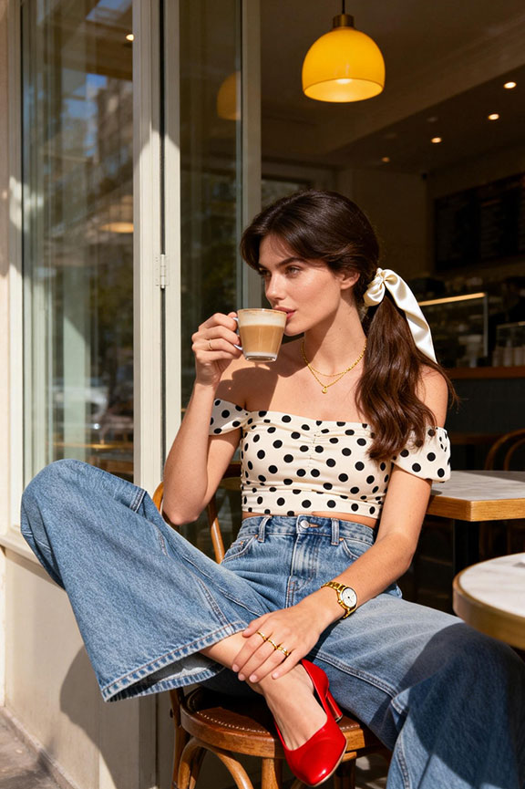 A fitted bustier with polka dots brings vintage charm—the pattern adds playful refinement while the structured silhouette creates a defined waistline. High-waisted wide-leg jeans balance the fitted top with relaxed sophistication, elongating legs naturally. Red heels inject bold contrast and elevate the casual denim. A cream satin headband and delicate gold jewelry—a simple necklace, watch, and rings—add polished finishing touches. This combination suits Valentine’s cocktail parties or dressy casual dinners, and the pieces separate easily for daytime wear with different styling.