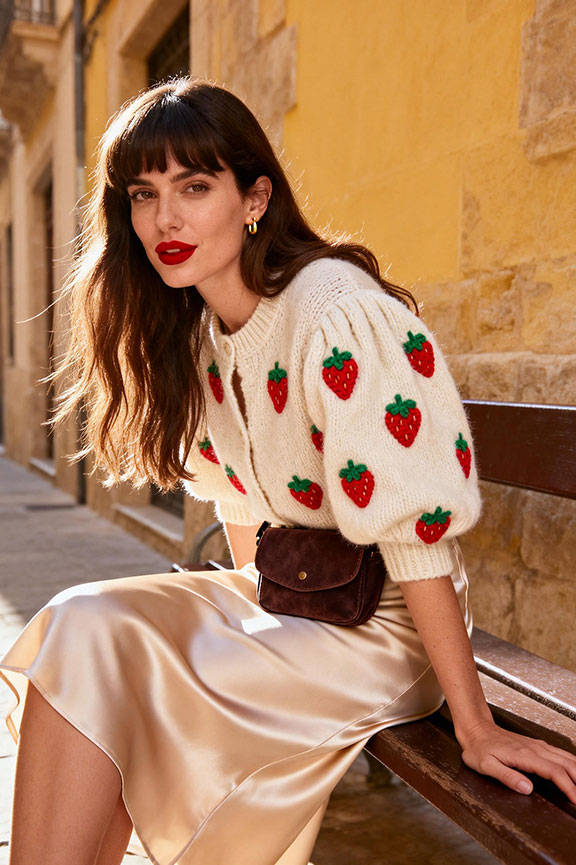 An ivory oversized cardigan brings playful charm with embroidered strawberry details—the soft knit contrasts beautifully with a sleek champagne satin midi skirt below. The skirt’s smooth drape adds elegant movement while keeping the look grounded and sophisticated. Small gold earrings add subtle shine without overwhelming the playful-yet-refined balance. This outfit works for Valentine’s brunch or casual daytime dates where you want something sweet but polished, and translates to spring gatherings or weekend celebrations.