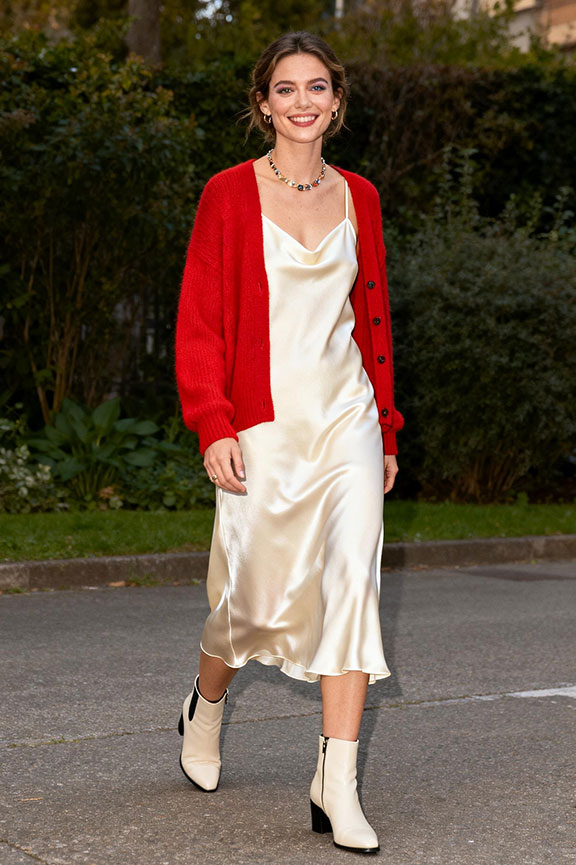 A red cardigan adds warmth without being too Valentine’s-obvious, while the satin slip skirt creates a smooth, flattering silhouette. Ankle boots finish it off with a hint of edge. Ideal for low-key dinners or drinks where you want to look intentional without overdressing—you can wear this for other semi-dressy evenings too.