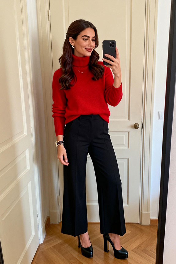 Red Turtleneck + Black Wide-Leg Trousers + Block Heels