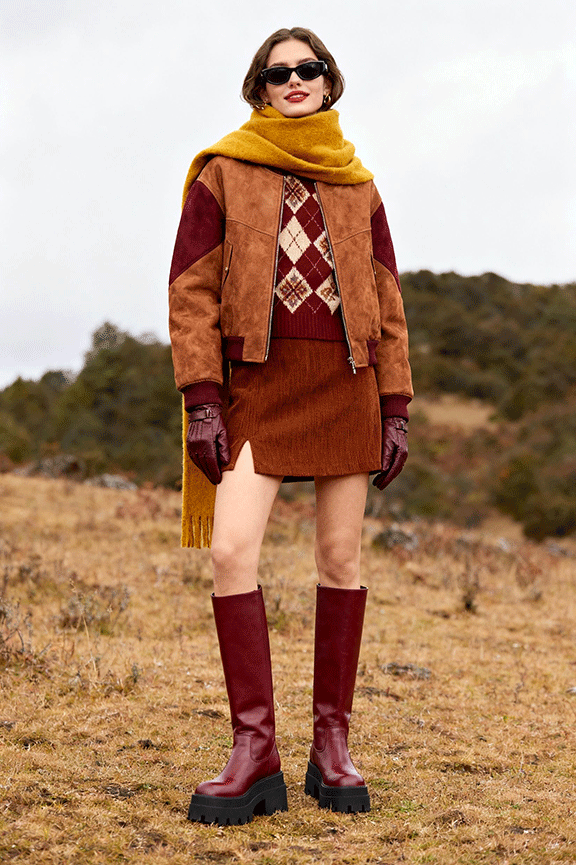 A brown jacket anchors the entire outfit. The ginger scarf and wine-red diamond-knit sweater add warmth and subtle color without overpowering the look. A brown mini skirt keeps the silhouette balanced, while wine-red boots create a cohesive color story. This ensemble feels layered and approachable, yet stylish. It’s a winter-ready outfit you’ll want to wear repeatedly.