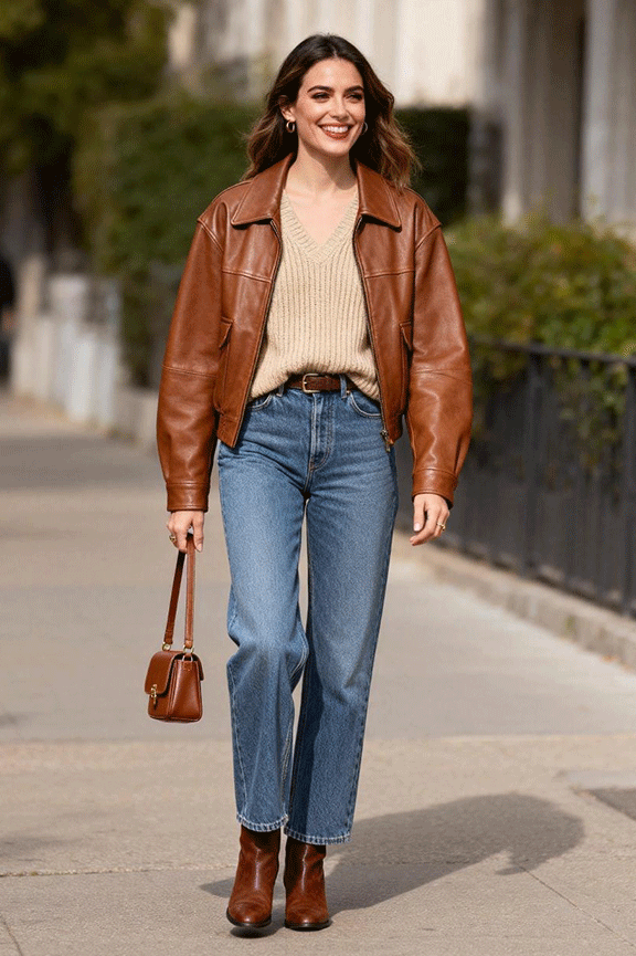 A warm brown leather jacket adds winter edge while staying versatile. Underneath, a beige or cream knit softens the look. Straight-leg jeans keep the silhouette clean. Complete with tan or chocolate ankle boots and a small satchel bag. This outfit is perfect for everyday errands or casual coffee meetups.
