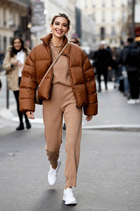 A brown puffer jacket keeps the outfit warm without looking too sporty. Layer a matching knit sweater and pants set underneath for comfort and cohesion. Finish with white or beige sneakers for casual mobility. Add a crossbody bag or backpack for daily errands. Ideal for running around town or low-effort winter days.