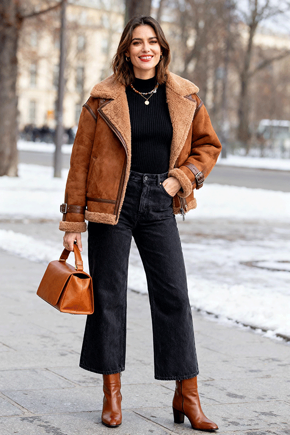 A brown shearling jacket offers instant texture and warmth. Layer a fitted black knit underneath for contrast. Pair with dark straight-leg jeans to balance proportions. Add brown leather ankle boots and a structured bag in caramel. Ideal for outdoor winter walks or casual weekend plans.